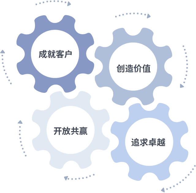 成就客户是一切决策的出发点,,,,创造价值是衡量所有工作的标准,,,,追求卓越是我们做事做人的态度,,,,开放共赢是我们的格局也是最终的结果。。。。价值观的齿轮环环相扣,,推动着组织里的每个人不断向前。。。。